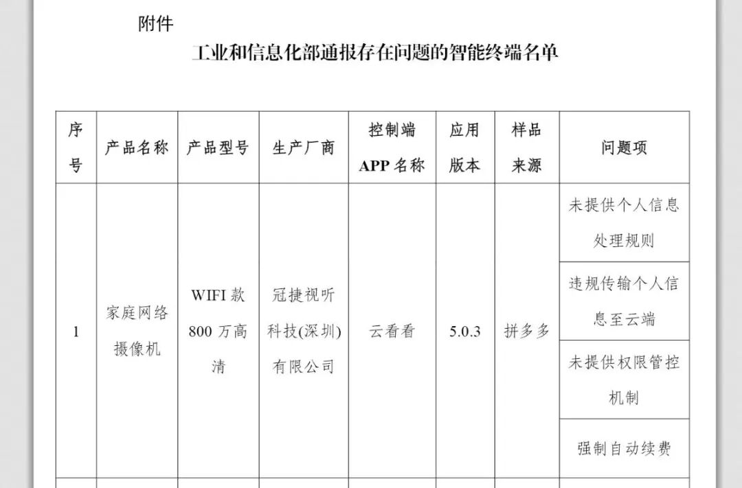 工业和信息化部在通报中明确认定,“家庭网络摄像机”和其控制端App“云看看”存在未提供个人信息处理规则、违规传输个人信息至云端、未提供权限管控机制、强制自动续费四项问题。