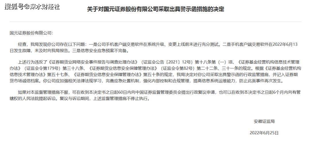 安徽证监局决定对国元证券采取出具警示函的行政监管措施,并记入证券期货市场诚信档案。
