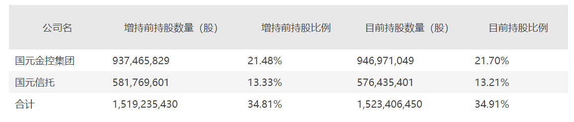 据了解,此次增持计划实施前,国元金控集团及其一致行动人安徽国元信托有限责任公司(下称:国元信托)持有公司股票15.19亿股,占公司总股本的34.81%;此次增持后,国元金控集团持有公司股9.47亿股,占公司总股本比例为21.70%(与国元信托合计持股15.23亿股,占总股本的34.91%)增持金额已超过拟增持金额上限的一半。