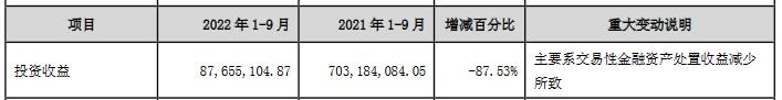 2022年前三季度,国元证券的投资收益为8765.51万元,上年同期为7.03亿元,同比减少87.53%。
