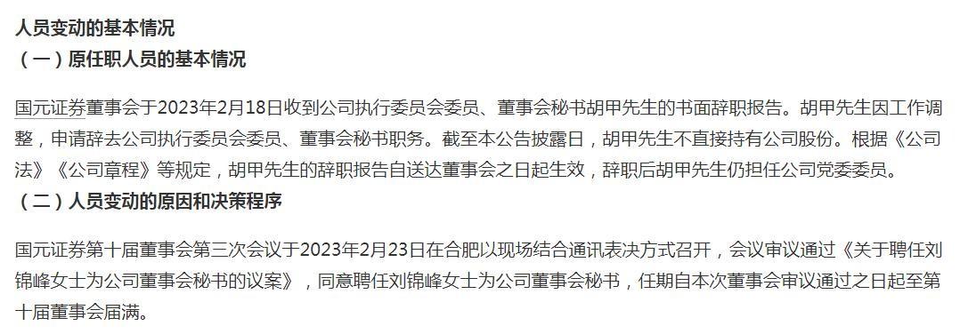 除此之外,国元证券高管出现变动。公告显示,国元证券董事会2月18日收到执行委员会委员、董事会秘书胡甲先生的书面报告,因工作调整辞去相关职务;2月23日公司召开会议审议同意聘任刘锦峰女士为董事会秘书。3月7日,国元证券公告称,聘任唐亚湖先生为公司合规总监,经监管部门认可之日起正式履职。