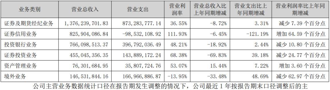 查阅年报数据发现,或是受证券市场影响,国元证券不仅权益投资下降,其主营业务的收入也出现下滑,从而导致总营收减少。年报显示,国元证券主营业务包括证券及期货经纪业务、证券信用业务、投资银行业务、证券投资业务、资产管理业务和境外业务。