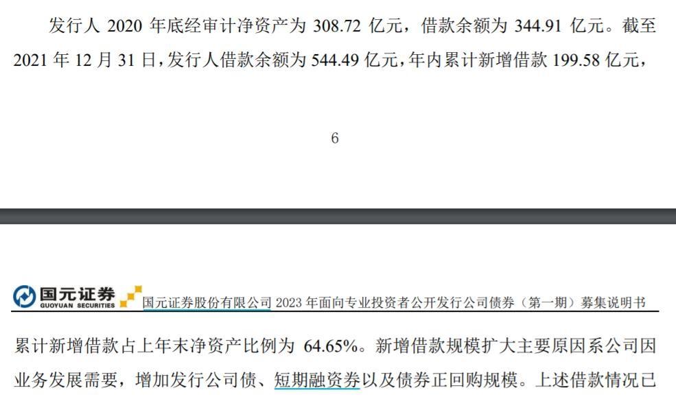 据了解,国元证券第一期债券发行规模不超过25亿元,发行价格为每张100元,票面利率为3.20%。本次债券募集资金扣除发行费用后,拟全部用于偿还公司债务和补充营运资金。募集说明书显示,截至2021年末,国元证券借款余额为544.49亿元,年内累计新增借款199.58亿元,累计新增借款占上年末净资产比例为64.65%。