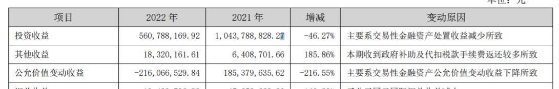 2022年国元证券投资收益5.61亿元,上年同期10.44亿元,同比下降46.27%;公允价值变动收益-2.16亿元,上年同期1.85亿元,同比下降216.55%;主要系交易性金融资产处置收益和交易性金融资产公允价值变动收益下降所致。