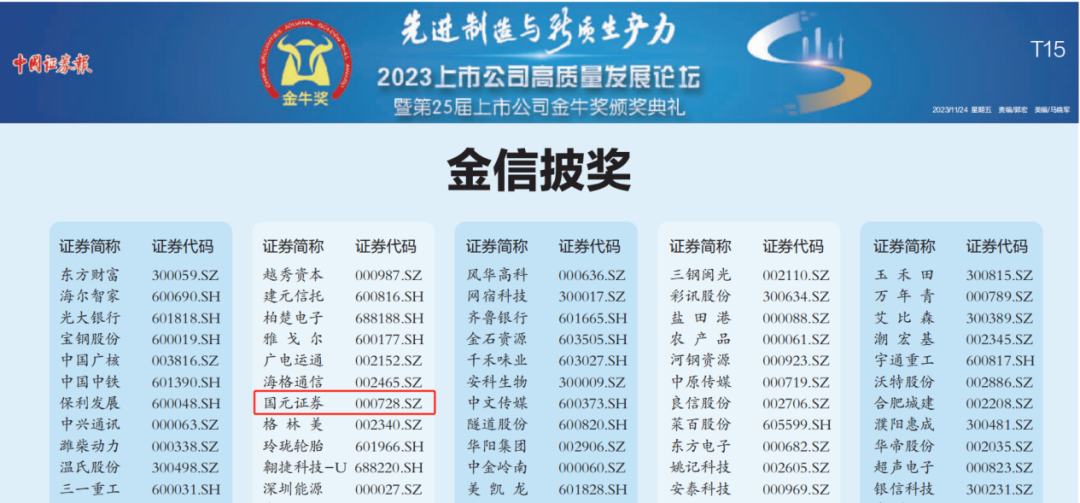 近日,在2023上市公司高质量发展论坛暨第25届上市公司金牛奖颁奖典礼上,国元证券凭借在多方面的优异表现,荣获“第25届上市公司金信披奖”。