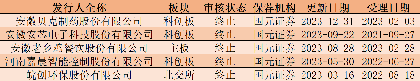 Wind数据显示,国元证券2023年还有5家保荐的拟上市公司终止了审核发行。