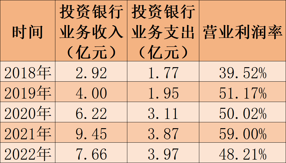 根据国元证券的财报显示,2018年至2022年,国元证券的投行业务收入分别为2.92亿元、4亿元、6.22亿元、9.45亿元和7.66元,营业利润率分别为39.52%、51.17%、50.02%、59.00%和48.21%。
