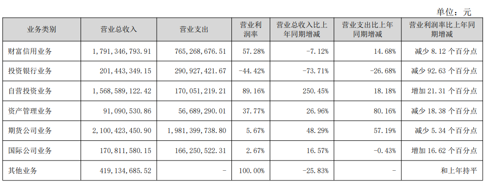 自营投资业务、财富信用业务、资产管理业务、期货公司业务、国际公司业务的营业利润率分别为89.16%、57.28%、37.77%、5.67%、2.67%。其他业务的营业利润率为100%。