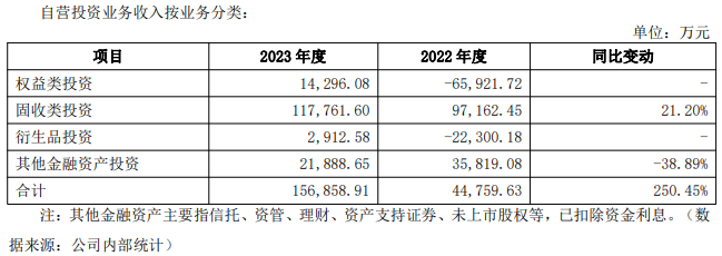 细分方面,固收类投资收入最高,达到11.78亿元;其他金融资产投资收入2.19亿元;权益类投资收入1.43亿元;衍生品投资收入为2912.58万元。