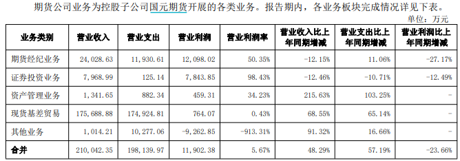 报告期内,国元期货现货基差贸易收入最高,为17.57亿元;期货经纪业务收入为2.40亿元,证券投资业务收入7968.99万元;资产管理业务收入为1341.65万元;其他业务收入为1014.21万元。