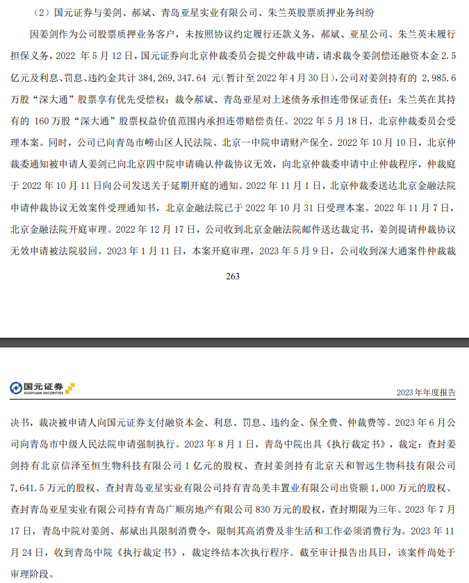 对照国元证券2023年报,三起在报告期内有进展的重大案件,两起来自股票质押业务纠纷。国元证券与姜剑、郝斌、青岛亚星实业有限公司(简称:亚星实业)、朱兰英的股质纠纷诉讼,正是其中之一。