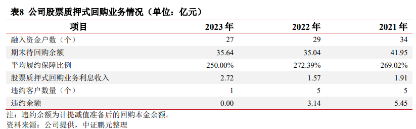 截至2023年底,国元证券融出资金余额为179.54亿元,减值准备余额为0.75亿元;买入返售金融资产账面余额为38.87亿元,其中股票质押式回购为35.68亿元、约定购回业务为1.18亿元、债券质押式回购为2.01亿元,减值准备余额为7.61亿元。