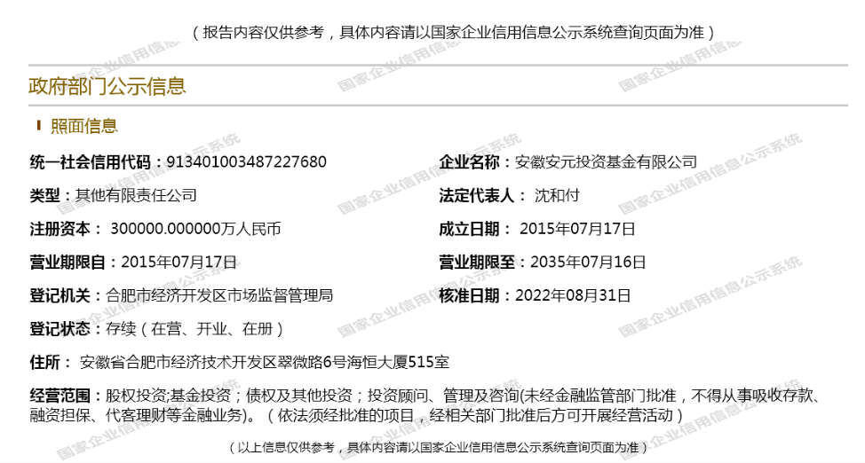 而在华信科技的历史股东中,行家意外发现了这家——安徽安元投资基金有限公司(简称:安元投资)。工商信息显示,安元投资成立于2015年7月17日,注册资本30亿元,实缴比例100%。而其法定代表人,赫然显示:沈和付。