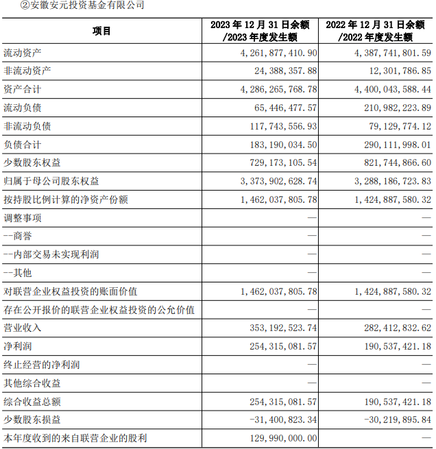 安元投资在2023年营业收入为3.53亿元,同比增长25.06%;净利润达到2.54亿,同比增速达到33.47%。此外,安元投资为国元证券贡献了1.30亿元的股利。
