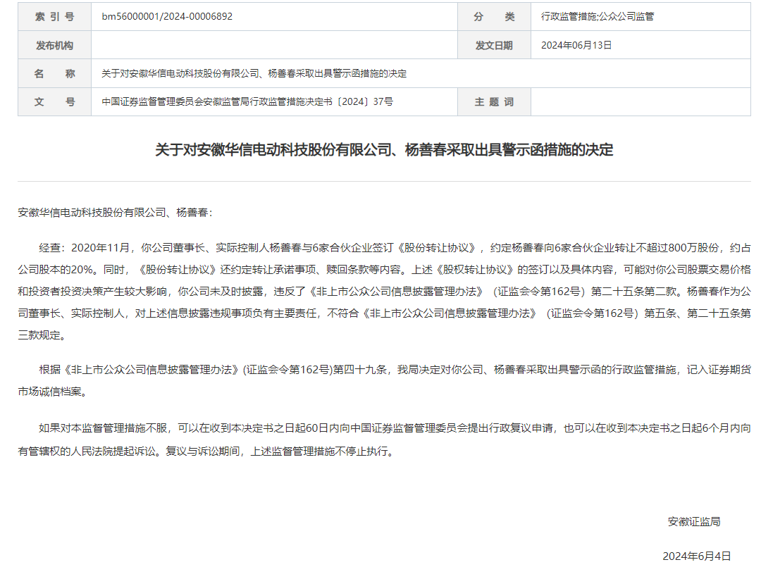 安徽证监局刚刚更新的〔2024〕37号监管处罚函,点名安徽华信电动科技股份有限公司(简称:华信科技)及实控人的信披违规事项。