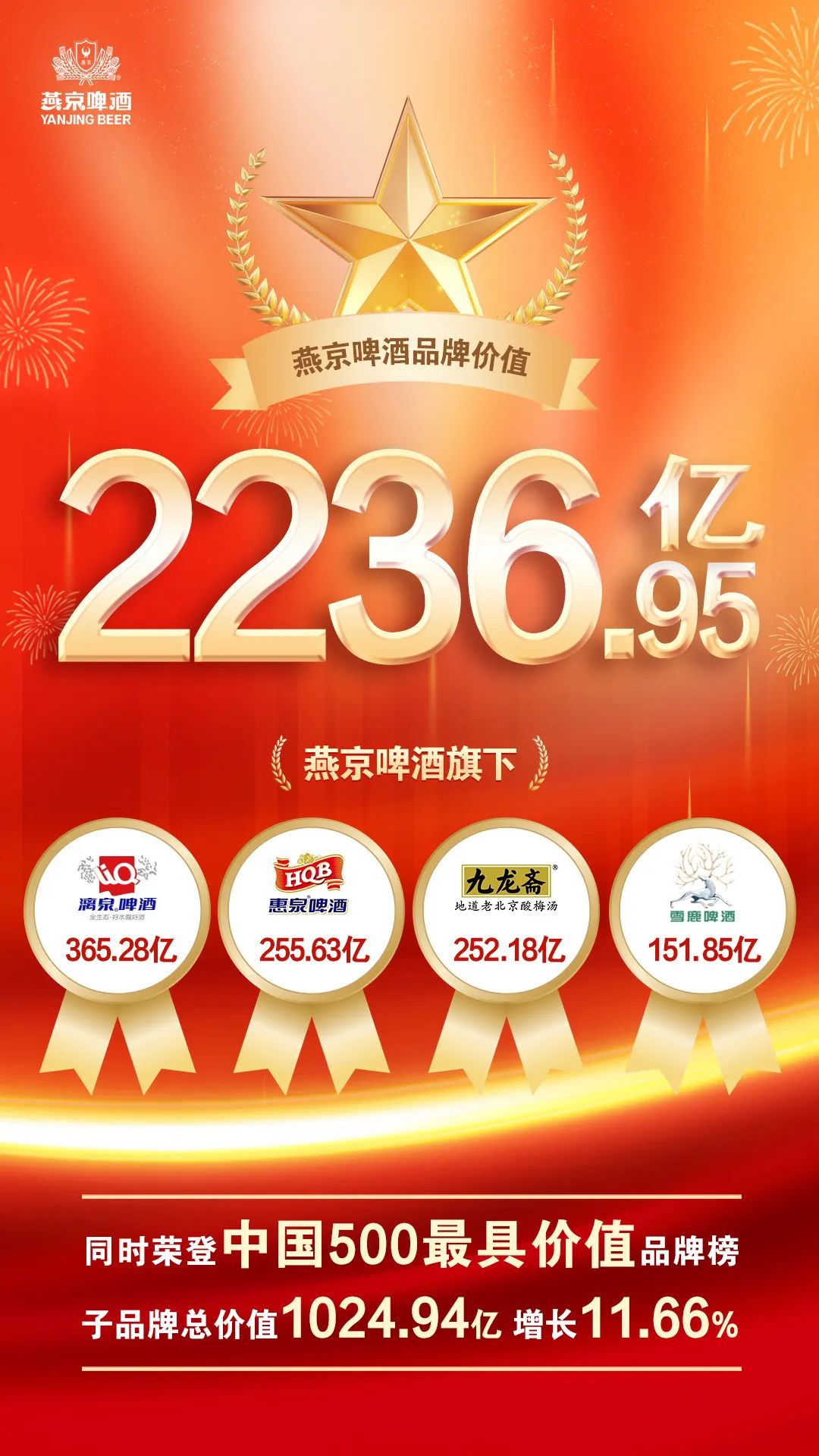 作为中国民族品牌的代表,燕京啤酒以“十四五”战略规划为指引,开展市场焕新、供应链转型及数智化升级,品牌建设卓有成效,以2236.95亿元的品牌价值再次上榜,品牌实力和市场竞争力获得业内认可。