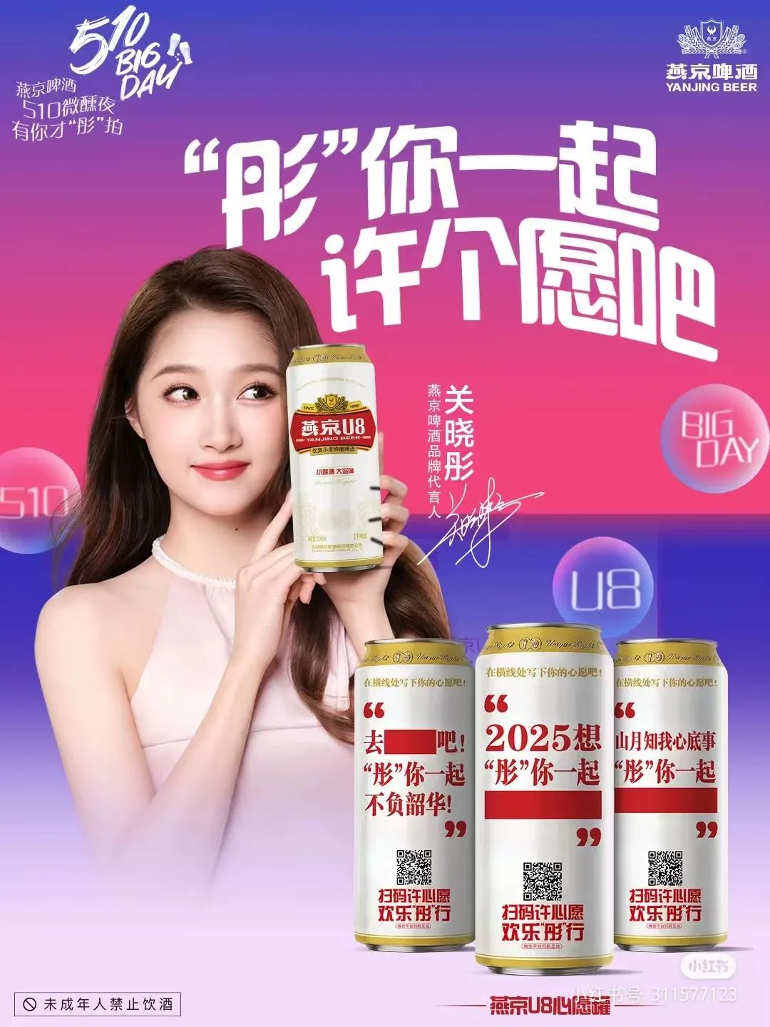 面对传播环境的高速变革,燕京啤酒以新兴的AR互动视觉形式与文化IP共创为核心引擎,开启营销新纪元。2024年底,品牌官宣“国民闺女”关晓彤为代言人,话题登顶热搜,其亲和力形象与燕京“亲民、活力”定位高度契合,迅速拉近与核心年轻客群的距离。