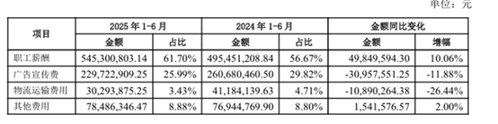 值得注意的是,燕京啤酒2025上半年净利润增速显著高于营收增速,这一差异或源于其对于经营结构的把控,数据显示,报告期内公司营业成本同比仅增长2.35%,低于营收增速;此外,尽管营收规模持续扩大,公司营销投入未见同步增长,其中销售费用仅勉强增长1.09%。更值得警惕的是,在人力成本职工薪酬上升10.06%的同时,广告宣传费却骤降11.88%,物流运输费更是锐减26.44%。