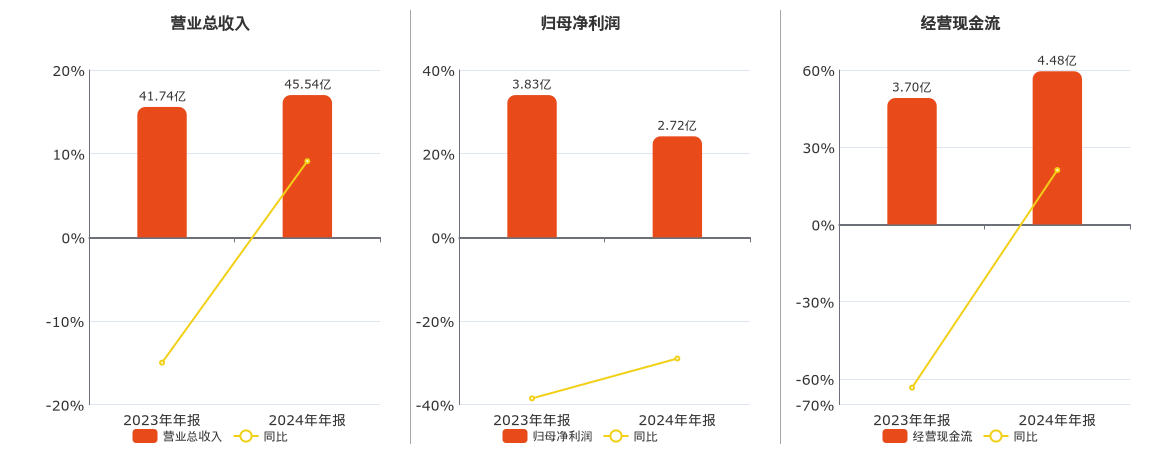 公司营业总收入为45.54亿元,在已披露的同业公司中排名第19,较去年同报告期营业总收入增加3.80亿元,同比较去年同期上涨9.10%。归母净利润为2.72亿元,在已披露的同业公司中排名第13,较去年同报告期归母净利润减少1.11亿元,同比较去年同期下降28.97%。经营活动现金净流入为4.48亿元,在已披露的同业公司中排名第13,较去年同报告期经营活动现金净流入增加7809.20万元,同比较去年同期上涨21.13%。
