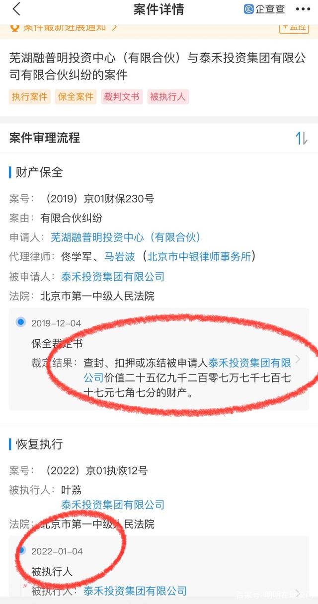 2022年1月4日,上班第一天,华融集团接到北京市第一中级人民法院对泰禾集团的大股东泰禾投资集团的“恢复执行”令。