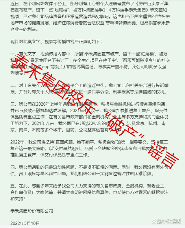 在2021年泰禾集团营收急剧下跌,只有6.6亿元,而亏损却将近大约8.5亿元,现在的泰禾集团负债率极高,被执行总金额为154.84亿。曾有消息称,万达将接手泰禾集团,泰禾集团有望重组,但是万科表示这个消息不属实,而泰禾集团近日也是回应了关于所谓的集团破产的消息,发出声明怒斥纯属谣言,同时表示公司将会尽快复工。