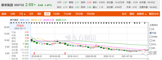 泰禾集团股票在2月14日为3.59元/股,经过不到一个月的持续下跌,3月11日开盘跌至2.69元/股。股市低迷,泰禾集团股价更是跳水,截止到发文日期,泰禾的市值只剩下66.9亿元。甚至都不及泰禾集团被司法执行金额的一半。