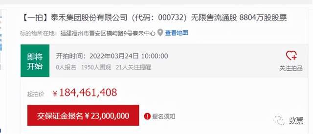 3月3日,据京东网络司法拍卖平台显示,北京市第二中级人民法院将于3月24日至3月25日,对标的物泰禾集团股份有限公司8804万无限售流通股进行第一次拍卖。
