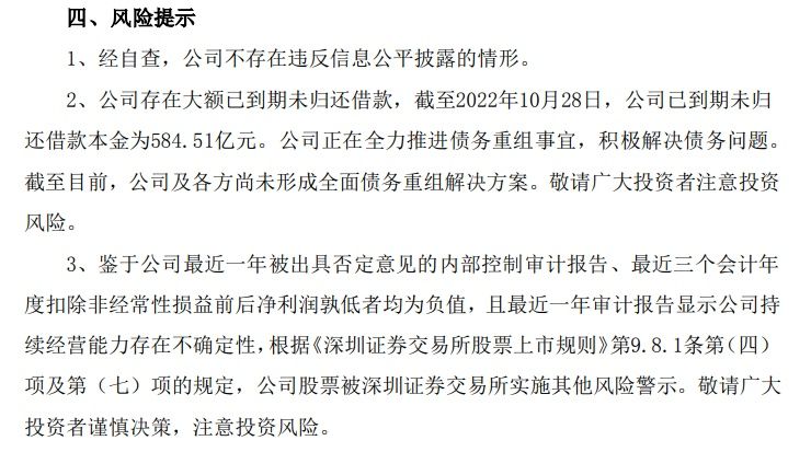 同时公司公告风险提示,公司存在大额已到期未归还借款,截至2022年10月28日,公司已到期未归还借款本金为584.51亿元。公司正在全力推进债务重组事宜,积极解决债务问题。截至目前,公司及各方尚未形成全面债务重组解决方案。
