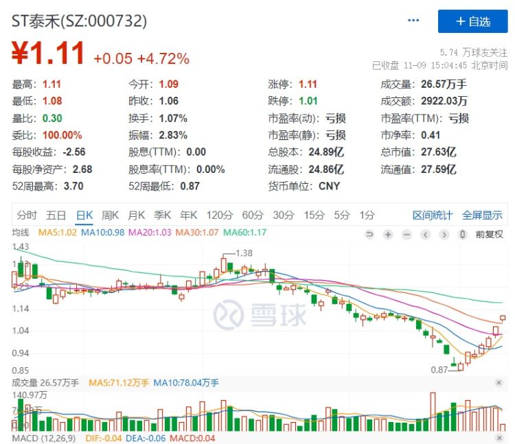 截至11月9日收盘,ST泰禾涨4.72%,报1.11元/股,总市值为27.63亿元。