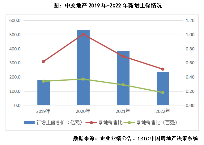 近几年中交地产拿地态度较为积极,2019年-2022年的拿地销售金额比均高于百强,其中2022年中交地产新增土储总建面128.6万平方米,新增土储总价234.4亿元,拿地销售金额比达到0.51,高于百强平均的0.18。