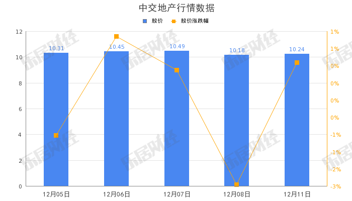 截至12月11日,中交地产(000736.SZ)股价收盘报10.18元,涨0.59%,总市值71.21亿元。
