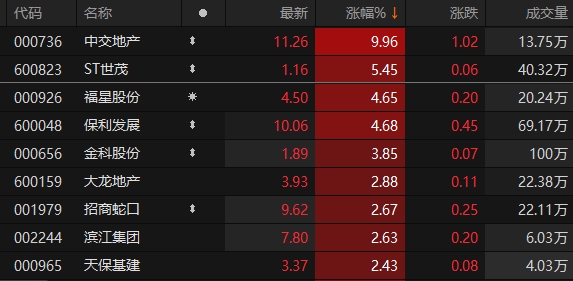 12月12日早盘,申万一级行业板块中,房地产板块表现强势。截至9时52分,中交地产、ST世茂涨停。福星股份、保利发展涨超4%,金科股份涨逾3%,大龙地产、招商蛇口等跟涨。