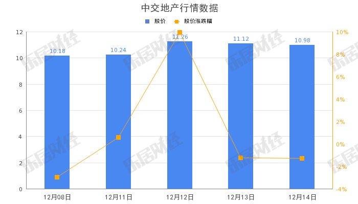 截至12月14日,中交地产(000736.SZ)股价收盘报11.12元,跌1.26%,总市值76.36亿元。