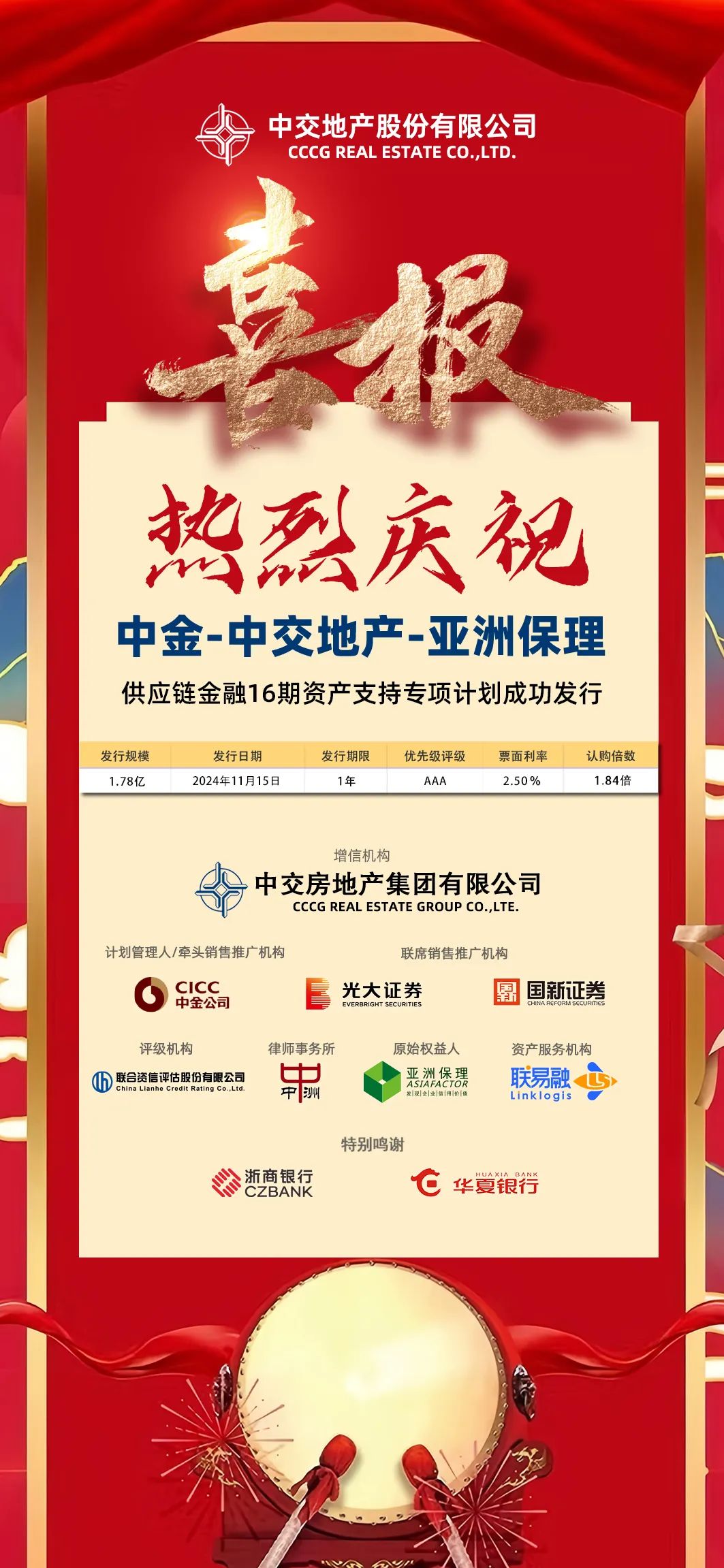 喜报 | 热烈庆祝中金-中交地产-亚洲保理供应链金融16期资产支持专项计划成功发行