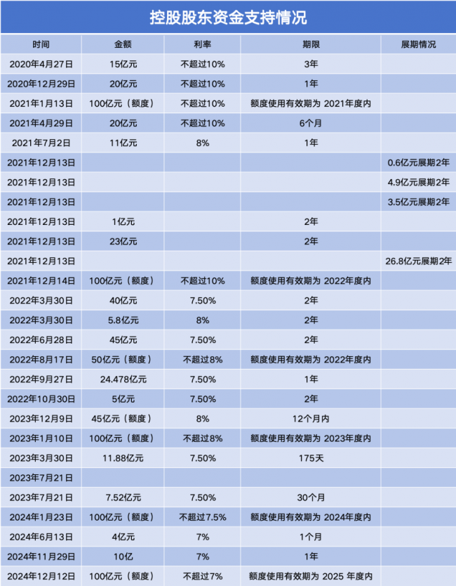 据当时的公告透露,上述展期金额合计62.18亿元,借款其他条件不变,展期后上述借款期限由不超过2年调整为不超过3年,借款年利率不变,仍为7.5%到8%。