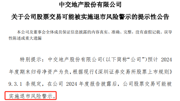 但对于中交地产可怕的不止于亏损,而是在这次亏损过后,公司的归母净资产可能为负。根据深交所的规则,如果一家公司的归母净资产是负数,那公司就会触发退市风险警示,变成ST然后退市。