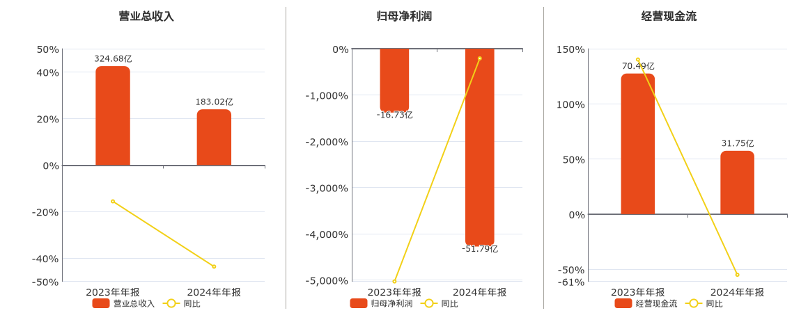 公司营业总收入为183.02亿元,较去年同报告期营业总收入减少147.26亿元,同比较去年同期下降44.59%。归母净利润为-51.79亿元,较去年同报告期归母净利润减少35.68亿元。经营活动现金净流入为31.75亿元,较去年同报告期经营活动现金净流入减少39.76亿元,同比较去年同期下降55.60%。