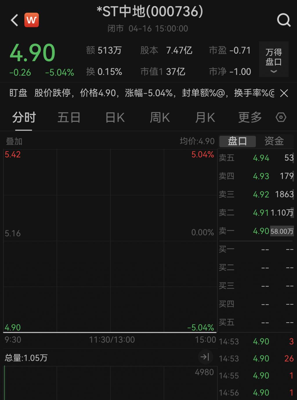 潇湘晨报辣椒财经记者留意到,4 月 16 日复牌后,中交地产的股票简称已变更为"*ST 中地"。截至 4 月 16 日闭市,中交地产股票下跌 5.04%。