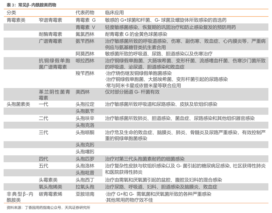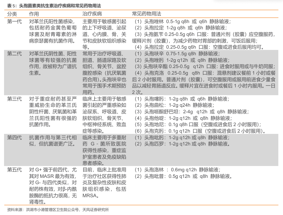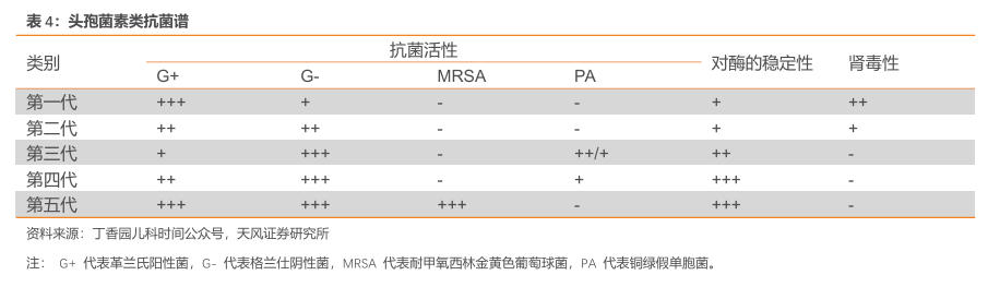 现头孢菌素类药物根据抗菌谱、抗菌活性、对β-内酰胺酶的稳定性、肾毒性的不同,分为五代,上市品种已达60余种。在抗菌谱方面,第一代头孢抗菌谱最窄,仅覆盖革兰阳性和部分革兰阴性菌;到二代、三代逐渐拓展,五代最广覆盖G+、G-以及MRSA。在对β内酰胺酶的稳定性方面,第五代(很稳定)=第四代(很稳定)第三代(高度稳定)第二代(较稳定)第一代(不稳定)。在肾毒性方面,第四代及第五代没有肾毒性,第三代基本没有肾毒性,第二代肾毒性较小,第一代对比前者,可以说肾毒性是最大的。