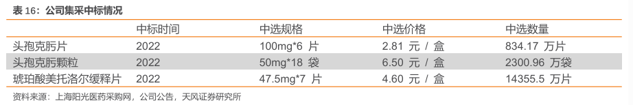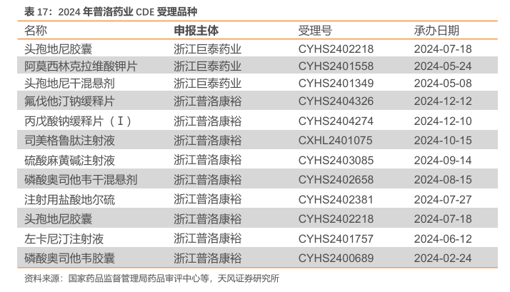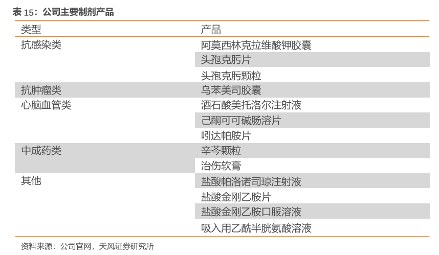 制剂业务多元发展策略,充分发挥原料药+制剂一体化优势。公司坚持以临床价值和市场价值为导向,加快推进“多品种”策略,充分发挥原料药+制剂一体化优势,依托高技术壁垒制剂技术平台,实现“做优制剂”的业务发展战略。截至2023年底,公司制剂品种120 多个,涉及抗感染类、心脑血管类、抗肿瘤类、中枢神经系类、中成药等;拥有天立威、巨泰、立安、百士欣等知名品牌;主打头孢菌素类、青霉素类、乌苯美司、左乙拉西坦、琥珀酸美托洛尔、盐酸金刚乙胺、左氧氟沙星、治伤软膏、辛芩颗粒等品种,涵盖片剂、缓释片、胶囊、颗粒、注射剂、小水针、口服液、软膏等剂型,产业链完善(以自产原料为主)、剂型齐全、涉及治疗领域广泛;拥有院内和院外销售队伍150 余人,全渠道覆盖。与此同时,制剂业务加快推进“多品种”发展策略,已立项25个新项目并在持续新增中,涉及抗感染类、心脑血管类、中枢神经系统类、化痰利胆类等多个领域。