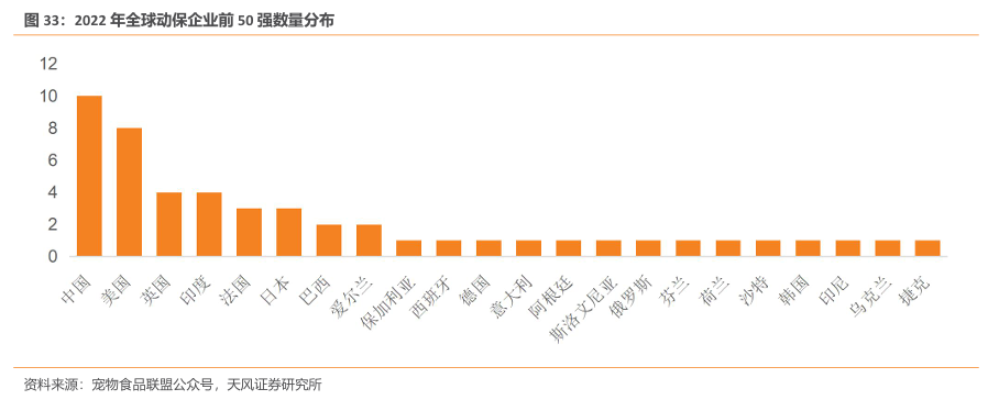 全球兽药产业发展高度集中,中国占比最高。2022年全球动保企业前50强中,20%(10家:中牧股份动保、瑞普生物、齐鲁动保、生物股份/金宇生物、易邦生物、鲁抗医药动保、金河生物动保、普莱柯、海正药业、永顺生物)来自中国,16%(8家:硕腾、默沙东/默克-动保、礼蓝、爱德士 IDXX实验室公司、辉宝动保、赫斯卡公司、纽勤动保、ImmuCell公司)来自美国,8%来自英国和印度(均为4家),6%来自法国和日本(均为3家),4%来自爱尔兰和巴西(均为2家),2%来自保加利亚等14个国家(均为1家)。