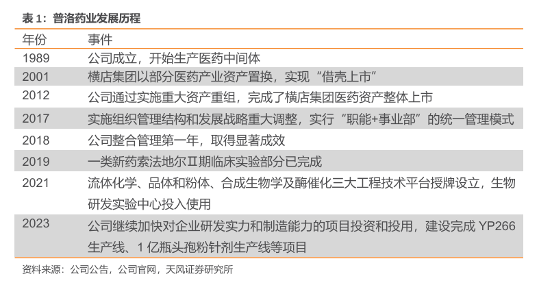 1989 年横店工业总公司先后投资设立了东阳市制药化工厂、东阳市有机合成化工厂、永安化工厂,公司成立,开始生产医药中间体;2001年,横店集团以部分医药产业资产置换,实现“借壳上市”;2012年公司通过实施重大资产重组,完成了横店集团医药资产整体上市;2017年公司实施组织管理结构和发展战略重大调整,实行“职能+事业部”的统一管理模式。