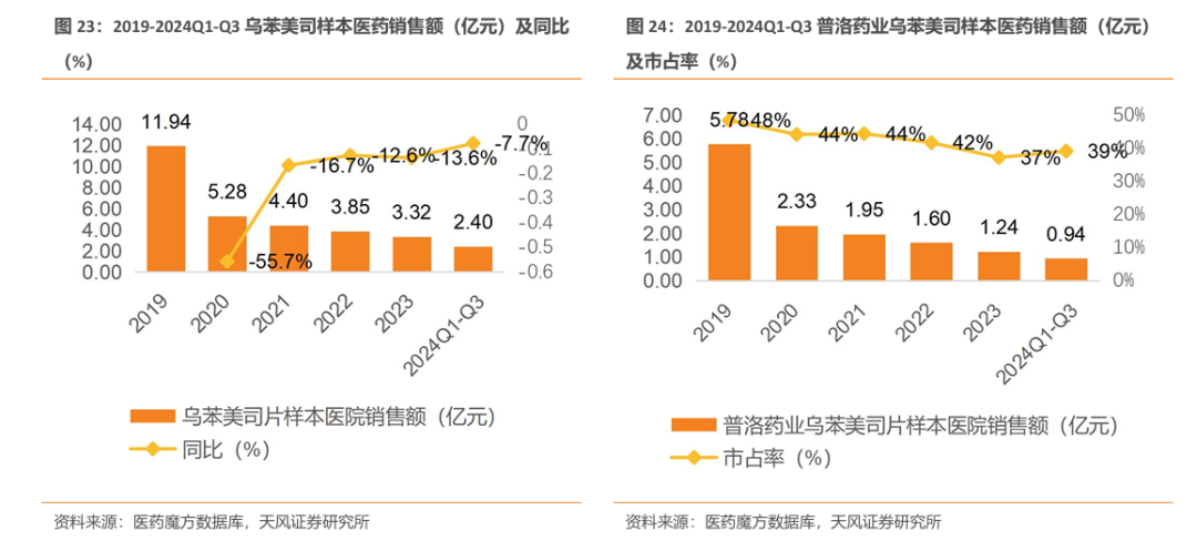 乌苯美司制剂集采后市场规模下降,公司份额维持稳定。普洛药业为全国首家通过乌苯美司制剂一致性评价的企业。医药魔方数据显示,集采后乌苯美司市场规模从2019年的11.94亿元降至2023年的3.32亿元;市场份额看,普洛药业市占率从2019年的48%降至2023的37%,2024Q1-Q3 市占率回升至39%,市场份额保持稳定。