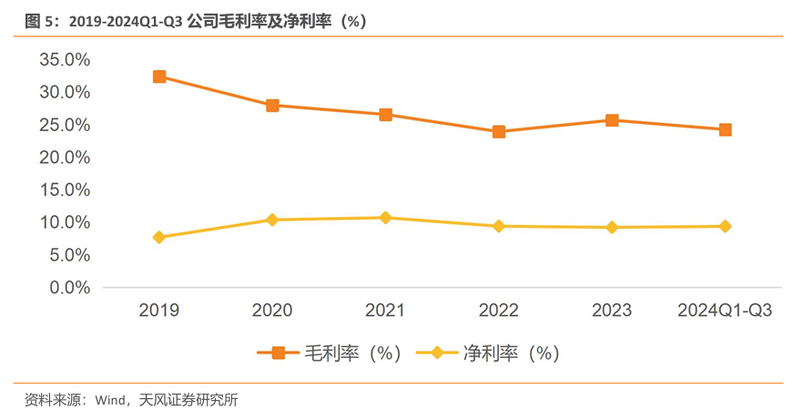 公司整体毛利率有所下降,净利率稳步提升。公司毛利率由2019年32.4%降至2022年23.9%。但是净利率水平稳步提升,由2019年的7.7%增长至2021年的10.7%。2024Q1-Q3公司利润率水平有所恢复,毛利率及净利率分别为24.2%及9.4%。在毛利率出现明显波动的情况下,公司净利率表现始终维持在7%-11%,体现公司良好的管理水平及竞争能力。