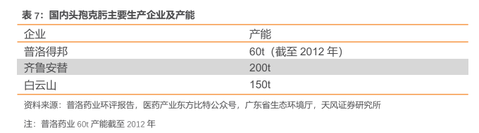 普洛医药为国内头孢克肟主要生产厂商。截至2012年数据,普洛得邦头孢克肟产能为60吨(时效性较早),为国内最大的头孢克肟生产厂家。占据国内份额60%以上;其余国内竞争者包括齐鲁安替(200吨)、广州白云山医药集团股份有限公司(150吨)。