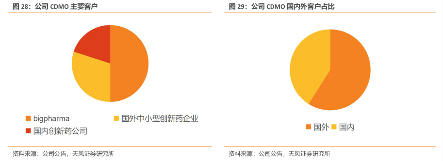 以bigpharma 为主要客户群体,目前已广泛覆盖全球市场。公司CDMO业务可以大致分为三类:一是bigpharma,约占营收50%;二是国外中小型的创新药企业,其稳定性比较好,具有长期合作关系,但是这类客户的订单数量相对不大,约25-30%的营收;三是国内的创新药公司,数量较多,但是商业化订单较少,大部分处于临床和验证阶段,占比20%左右。CDMO业务主要是为创新药企业服务,biapharma是公司目前最主要的营收来源,带来较为稳定的大订单;对于国内的创新药客户,公司主要紧跟头部企业,同时,也积极开拓其他公司,新项目大部分在临床期。整体来看,项目数量增长快速,目前国外客户占比59%,国内客户占比41%。