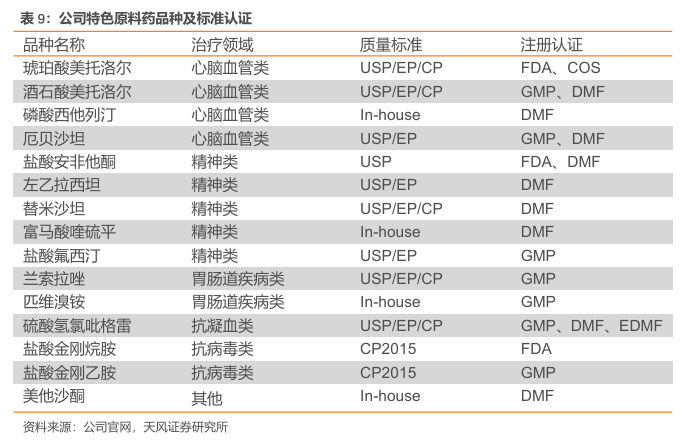 拥有独特市场竞争优势,获得多项质量标准及注册认证。公司特色原料药拥有独特的市场竞争优势,其中盐酸金刚烷胺、(伪)麻黄碱等原料药占有重要市场地位;盐酸安非他酮、沙坦联苯母核等具有市场主导地位。此外,公司多个品种还拥有USP、EP和CP的质量标准证明和FDA、GMP等注册标准证明,在国内外市场中有显著优势。