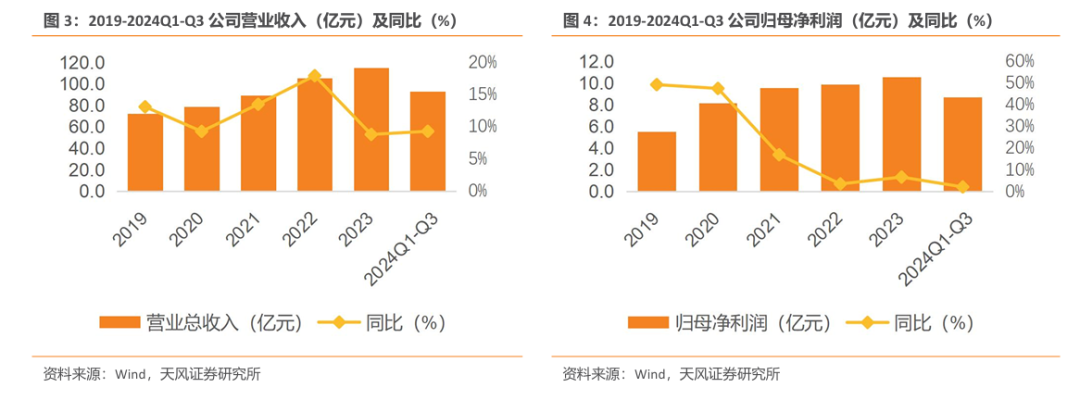 公司收入稳步增长,利润表现优于收入。公司收入从2019年的72.1亿元增长至2023年的114.7 亿元,期间CAGR达12.31%,归母净利润同期从5.5亿元增长至10.6亿元,期间CAGR达17.51%,增速远高于收入。2024Q1-Q3公司保持积极的发展势头,实现营业收入92.90 亿元(yoy+9.30%),实现归属上市公司股东的净利润8.70亿元(yoy+2.15%)