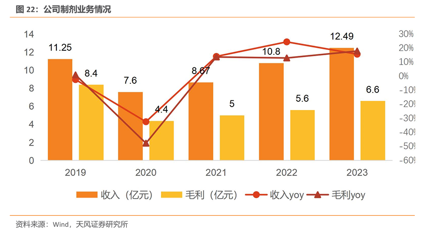 截至2023年底,公司现有制剂品种120多个,产业链完善(以自产原料为主)、剂型齐全、涉及治疗领域广泛;拥有院内和院外销售队伍150余人,全渠道覆盖。与此同时,制剂业务加快推进“多品种”发展策略,已立项25个新项目并在持续新增中,涉及抗感染类、心脑血管类、中枢神经系统类、化痰利胆类等多个领域。