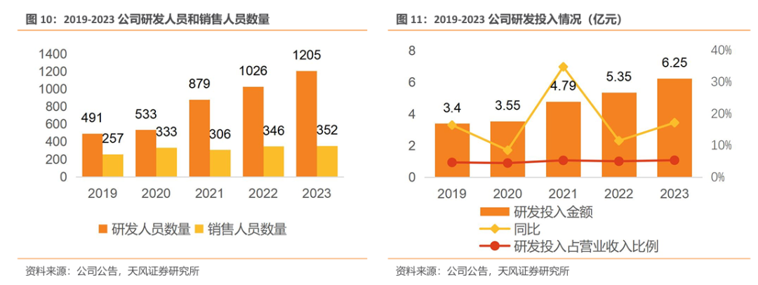 销售人员增长保持稳定,研发人员数量持续提升。公司始终坚持“创新驱动发展、人才引领创新”,持续加大研发投入,不断完善研发体系,2023年公司研发投入金额6.25亿元,同比增长17.25%,研发投入占总营收比重达5.40%,研发人员共计1205人。同时,销售人员保持稳定增长态势,由2019年的257人增长至2023年的352人。